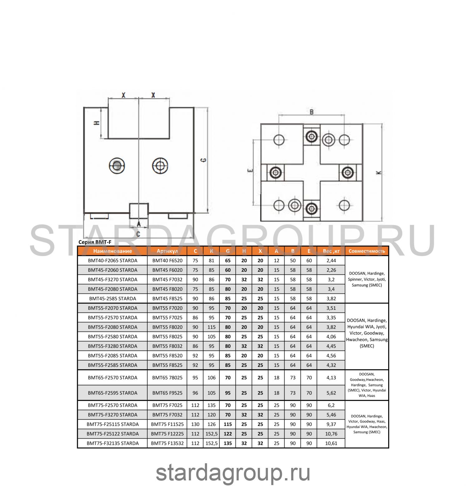 BMT-F STARDA инструментальный блок применяется для установки и надежной фиксации проходных резцов и державок с квадратным либо прямоугольным хвостовиком в радиальной плоскости относительно заготовки на револьверных головках токарных станков или обрабатывающих центрах с ЧПУ стандарта BMT.