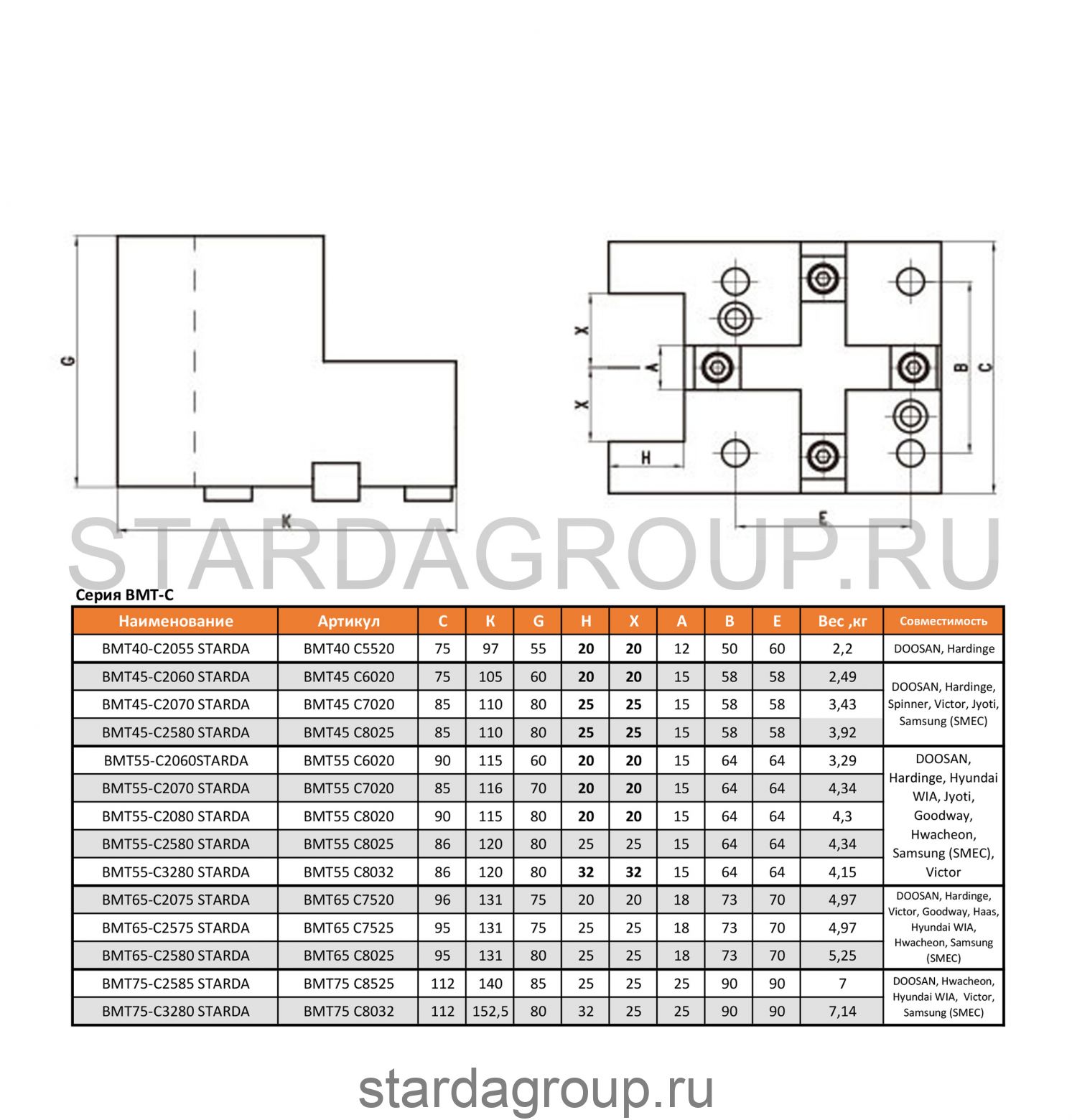 BMT-C STARDA инструментальный блок применяется  для установки и надежной фиксации проходных резцов и державок с квадратным либо прямоугольным хвостовиком в радиальной плоскости относительно заготовки на револьверных головках токарных станков или обрабатывающих центрах с ЧПУ стандарта BMT.