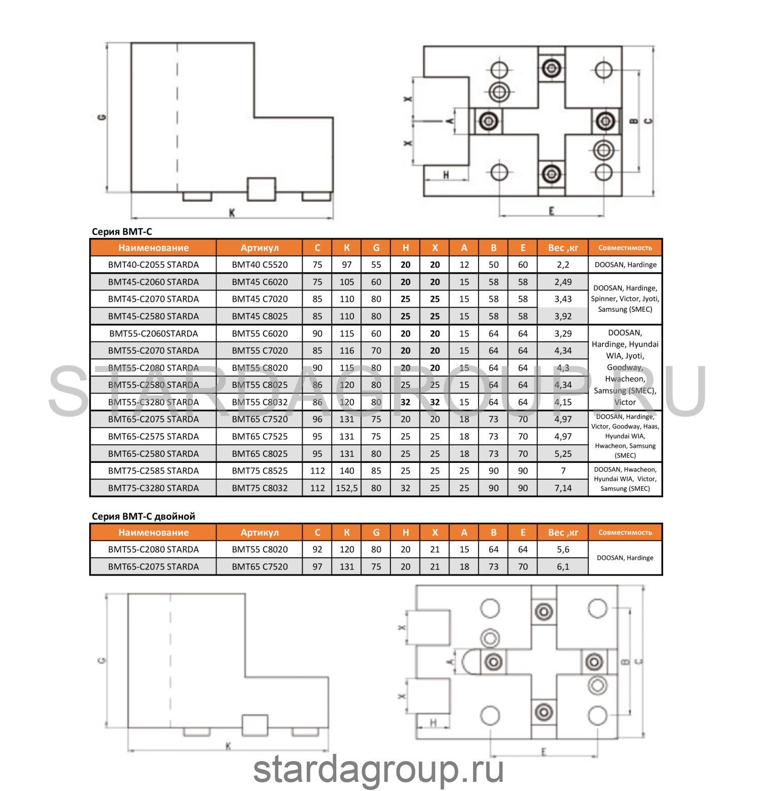 BMT-C STARDA инструментальный блок применяется для установки и надежной фиксации проходных резцов и державок с квадратным либо прямоугольным хвостовиком в радиальной плоскости относительно заготовки на револьверных головках токарных станков или обрабатывающих центрах с ЧПУ стандарта BMT.