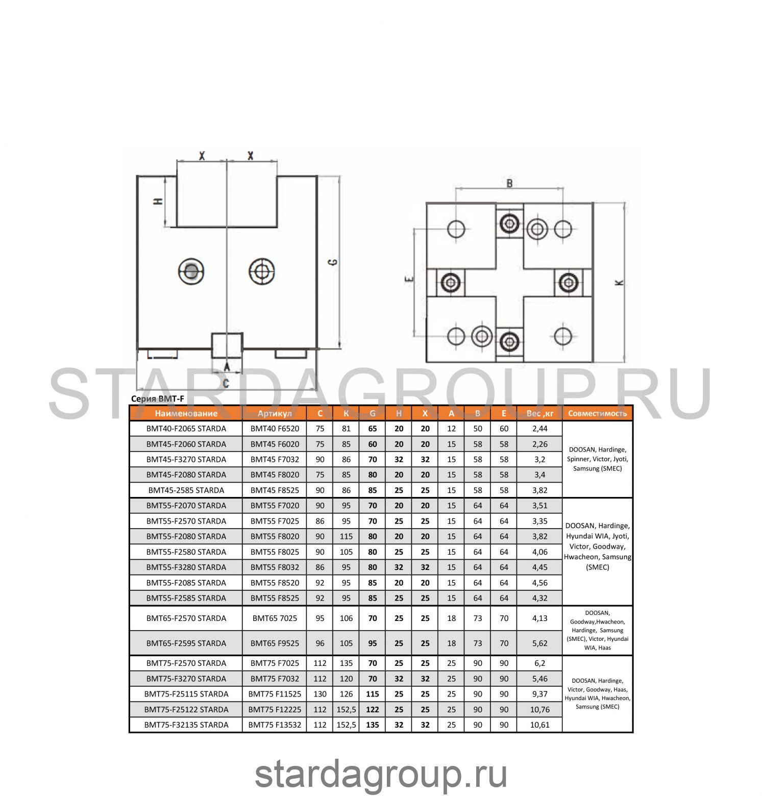 BMT-F STARDA инструментальный блок применяется для установки и надежной фиксации проходных резцов и державок с квадратным либо прямоугольным хвостовиком в радиальной плоскости относительно заготовки на револьверных головках токарных станков или обрабатывающих центрах с ЧПУ стандарта BMT.