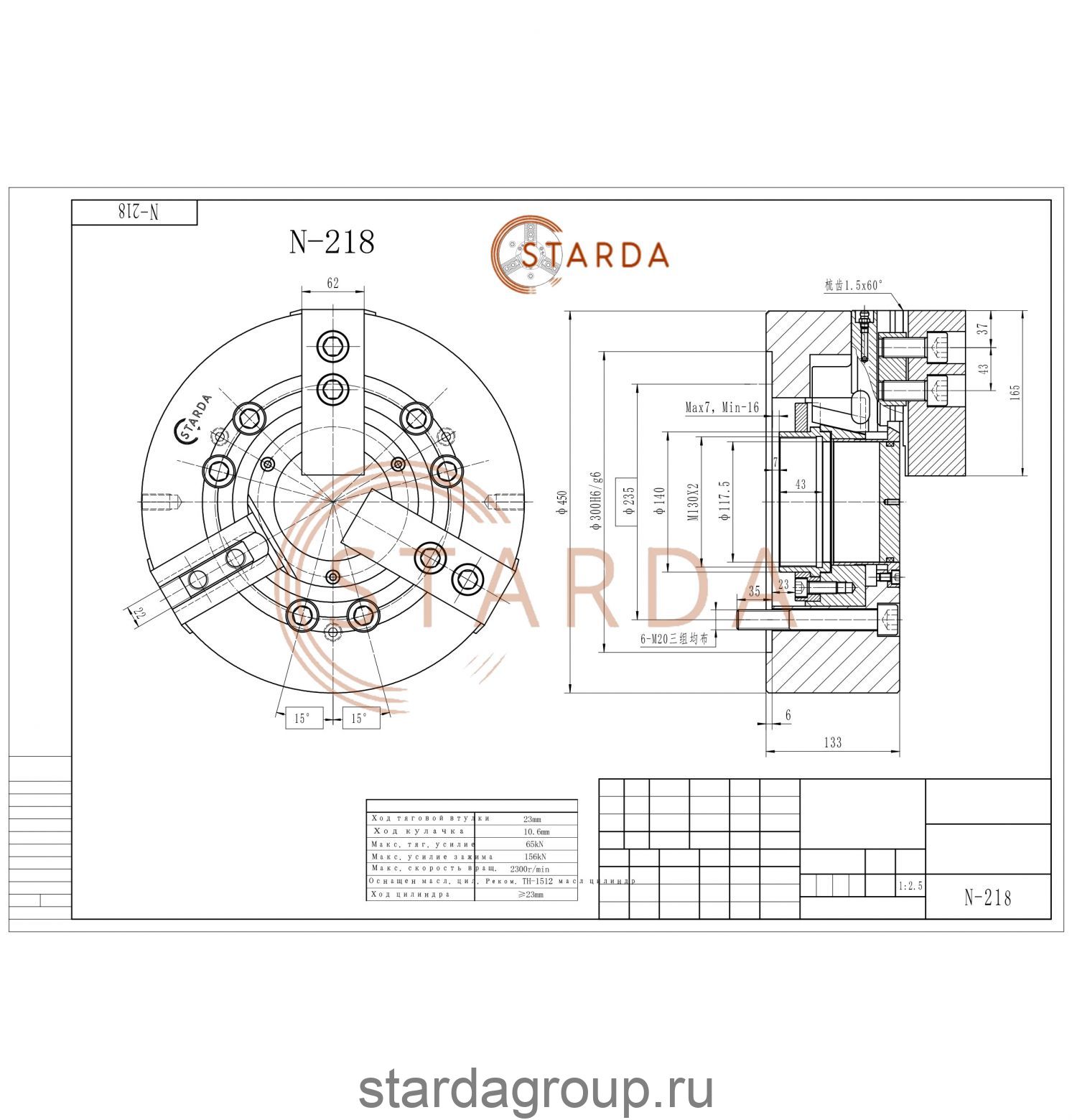 3-х кулачковый гидравлический патрон с проходным отверстием N-218 STARDA имеет диаметр корпуса 450 мм (18 дюймов), изготовлен из стали с используемой при изготовлении технологией процедуры закалки и шлифовки.