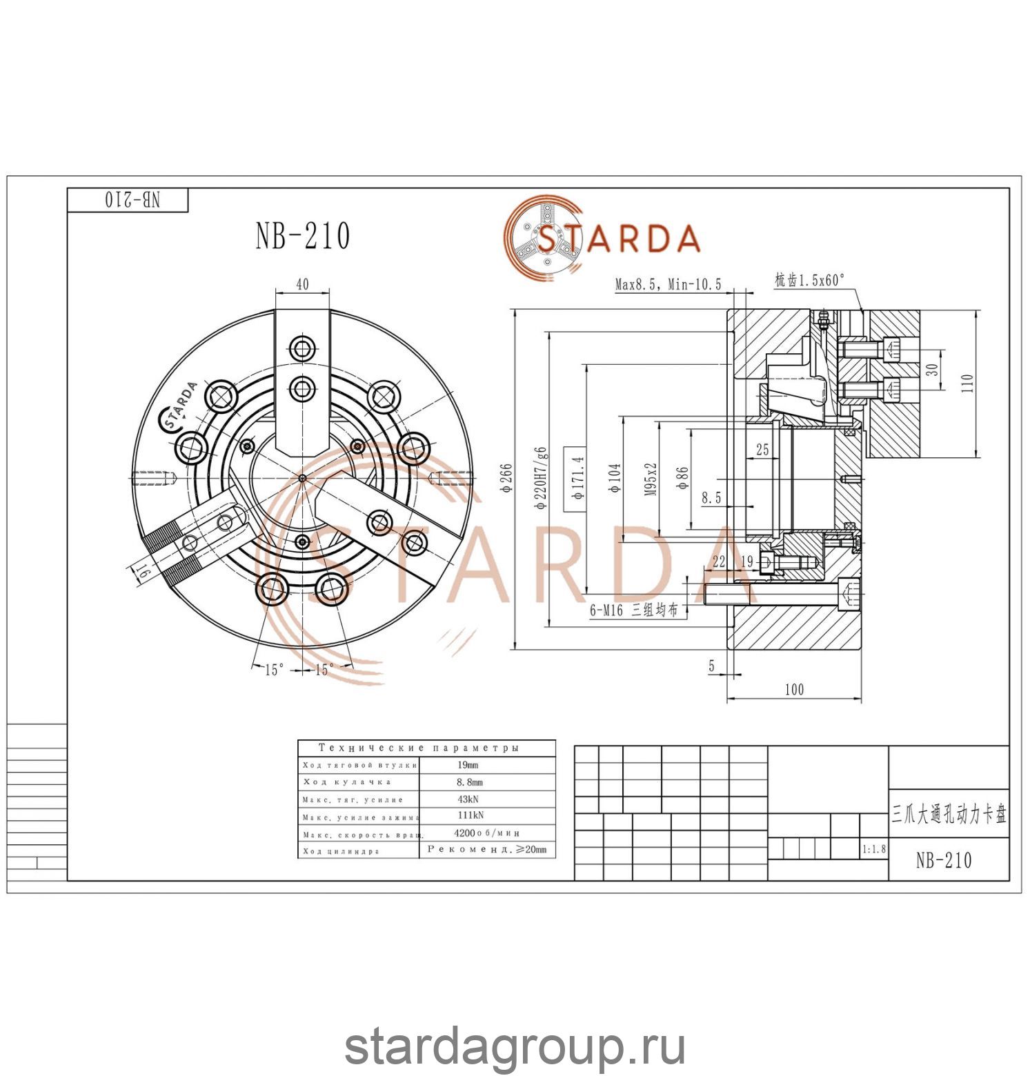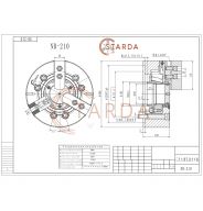 3-х кулачковый гидравлический патрон с проходным отверстием NB-210 STARDA имеет диаметр корпуса 268 мм, изготовлен из стали с используемой при изготовлении технологией процедуры закалки и шлифовки.