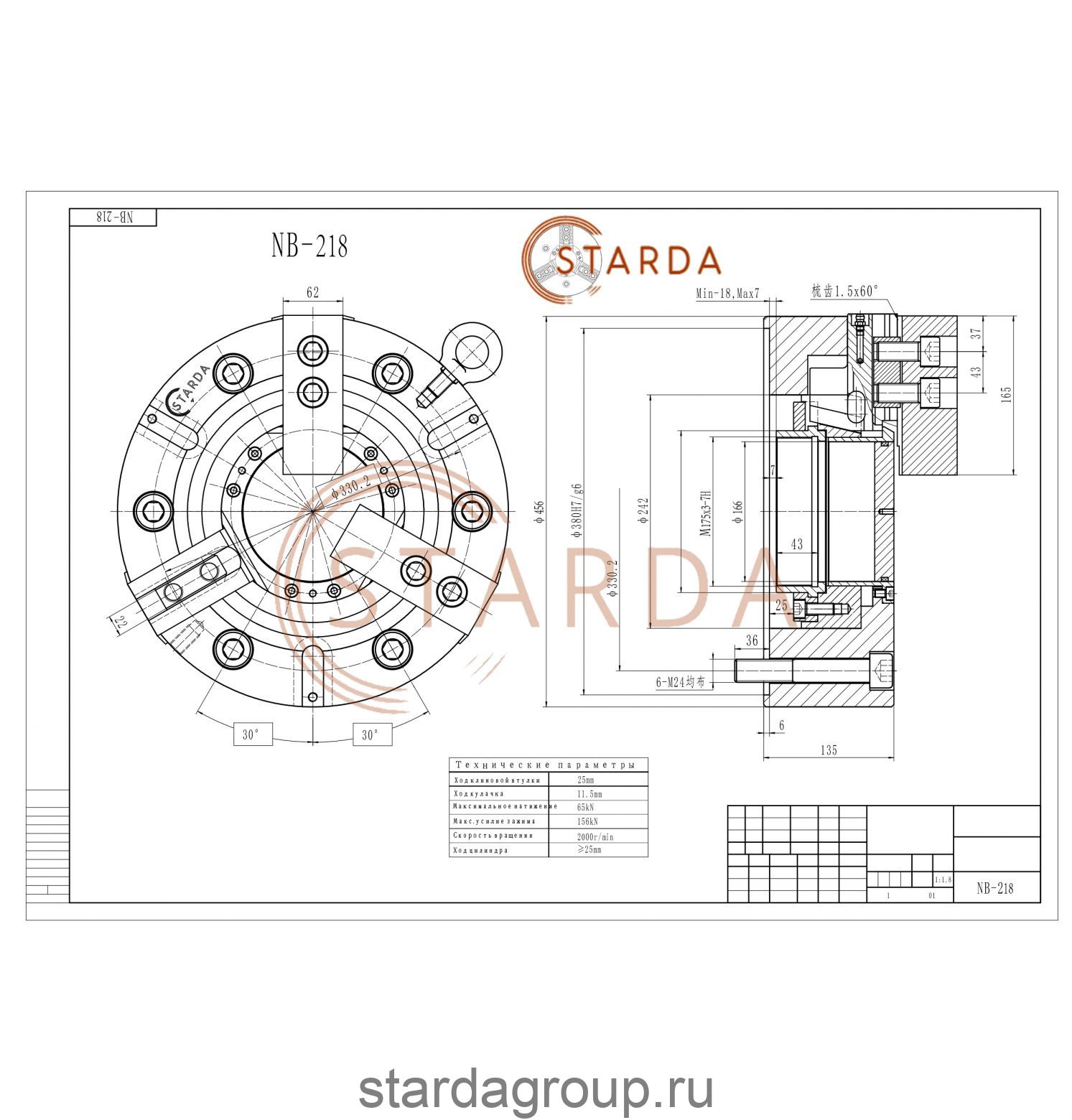 3-х кулачковый гидравлический патрон с проходным отверстием N-218 STARDA имеет диаметр корпуса 456 мм, изготовлен из стали с используемой при изготовлении технологией процедуры закалки и шлифовки.