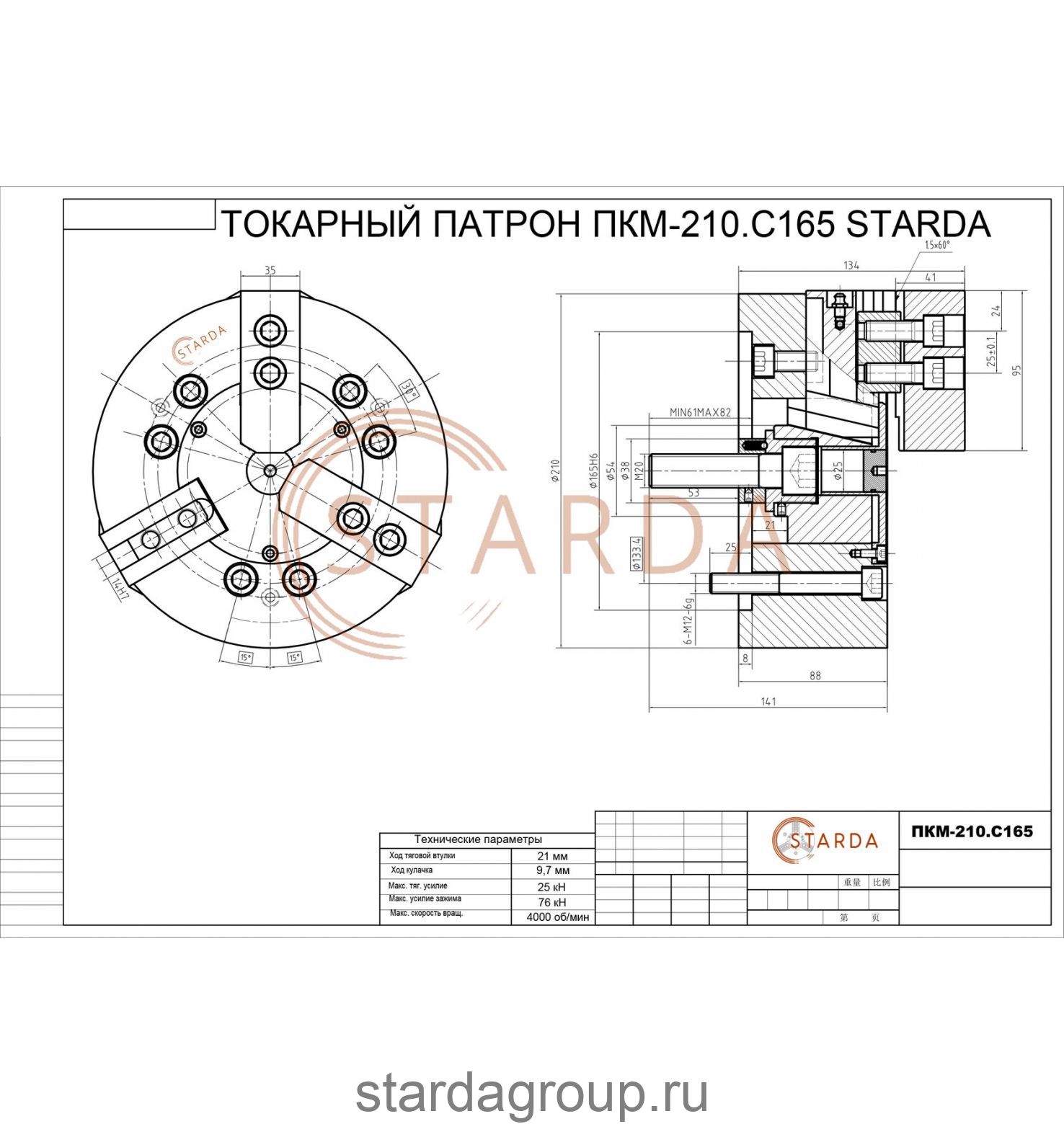 3-х кулачковый гидравлический патрон с закрытым центром ПКМ-210.C165 STARDA имеет диаметр корпуса 210 мм, изготовлен из стали с используемой при изготовлении технологией процедуры закалки и шлифовки.