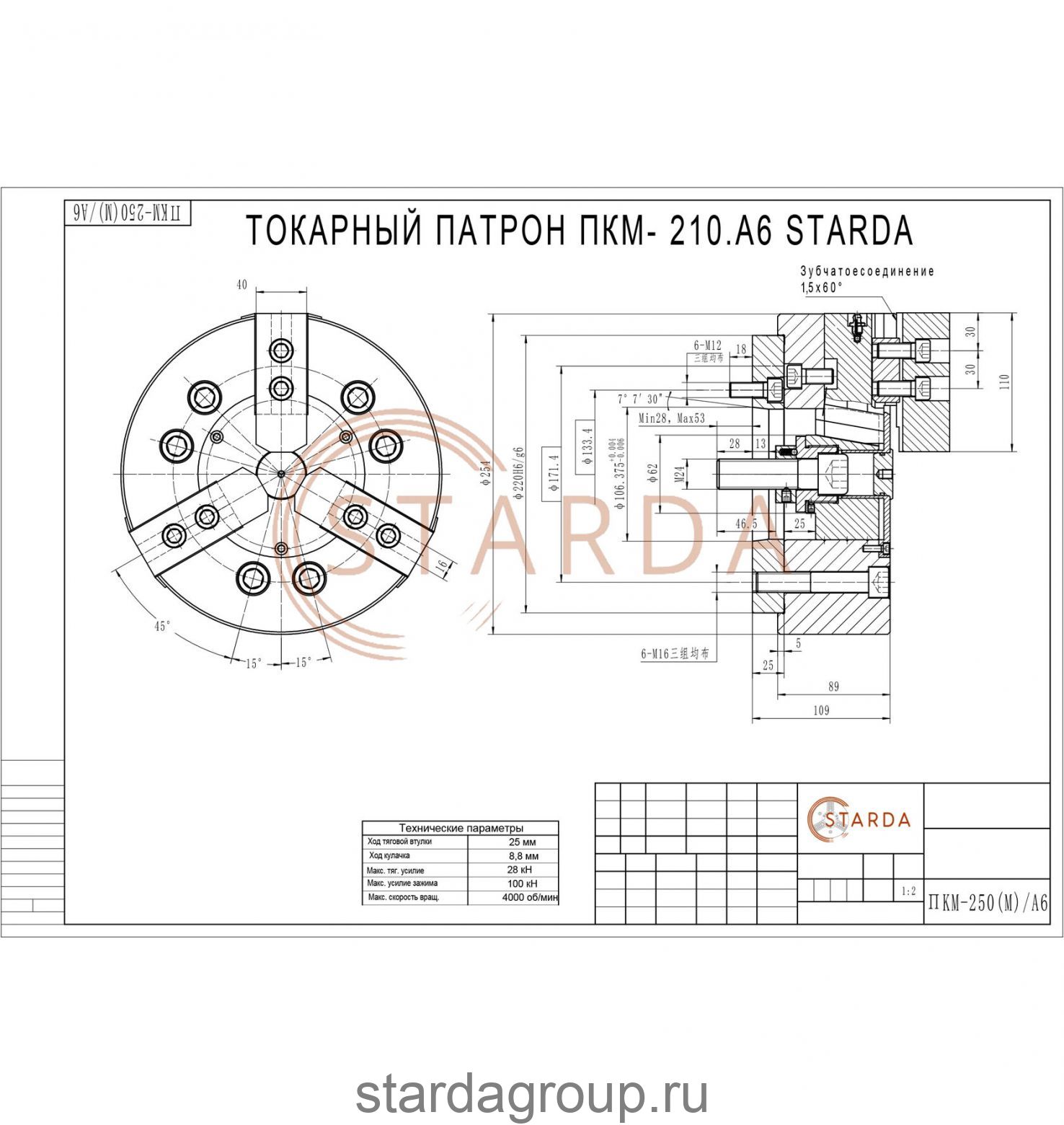 Патрон состоит из: корпуса патрона, мастер кулачка, комплекта сырых кулачков SJ-10 STARDA , Т-гаек, ручного ключа, заглушки для крышки.