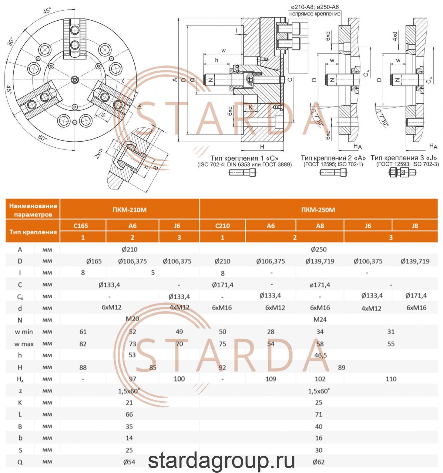 3-х кулачковый гидравлический патрон с закрытым центром ПКМ-250.A6 STARDA имеет диаметр корпуса 250 мм, изготовлен из стали с используемой при изготовлении технологией процедуры закалки и шлифовки.