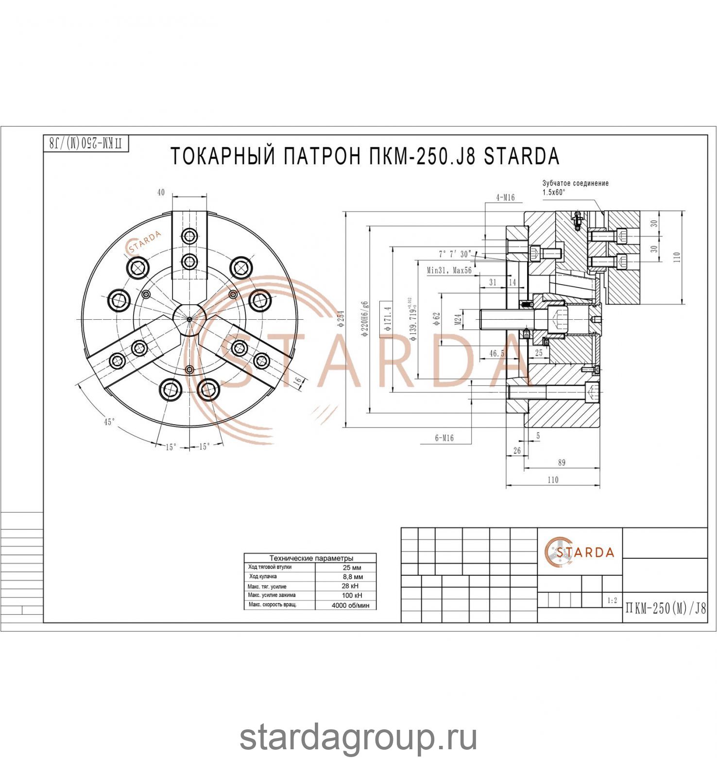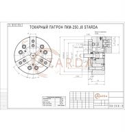 3-х кулачковый гидравлический патрон с закрытым центром ПКМ-250.J8 STARDA имеет диаметр корпуса 250 мм, изготовлен из стали с используемой при изготовлении технологией процедуры закалки и шлифовки.