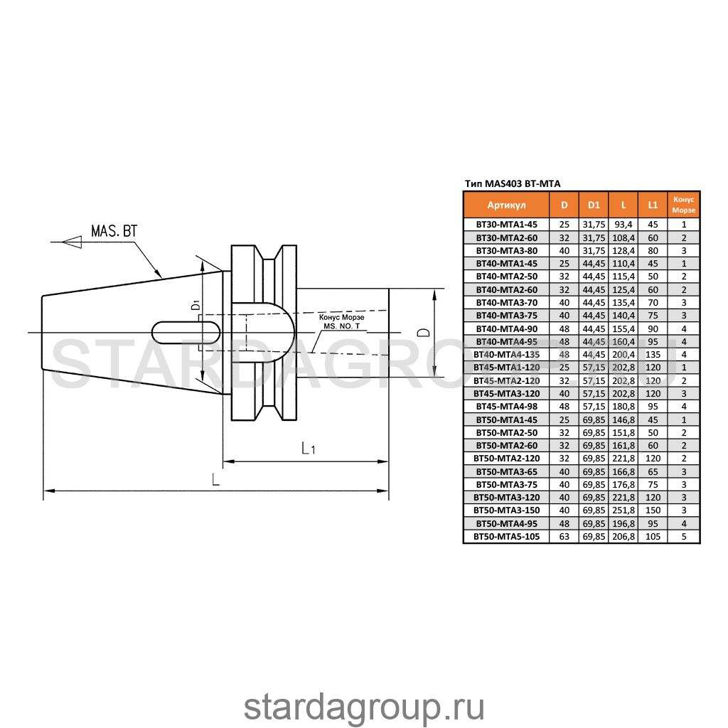 Оправка BT50-MTA3-150 STARDA используется для фиксации инструмента с хвостовиком конус Морзе с лапкой. В хвостовике есть паз для выбивания инструмента из оправки.