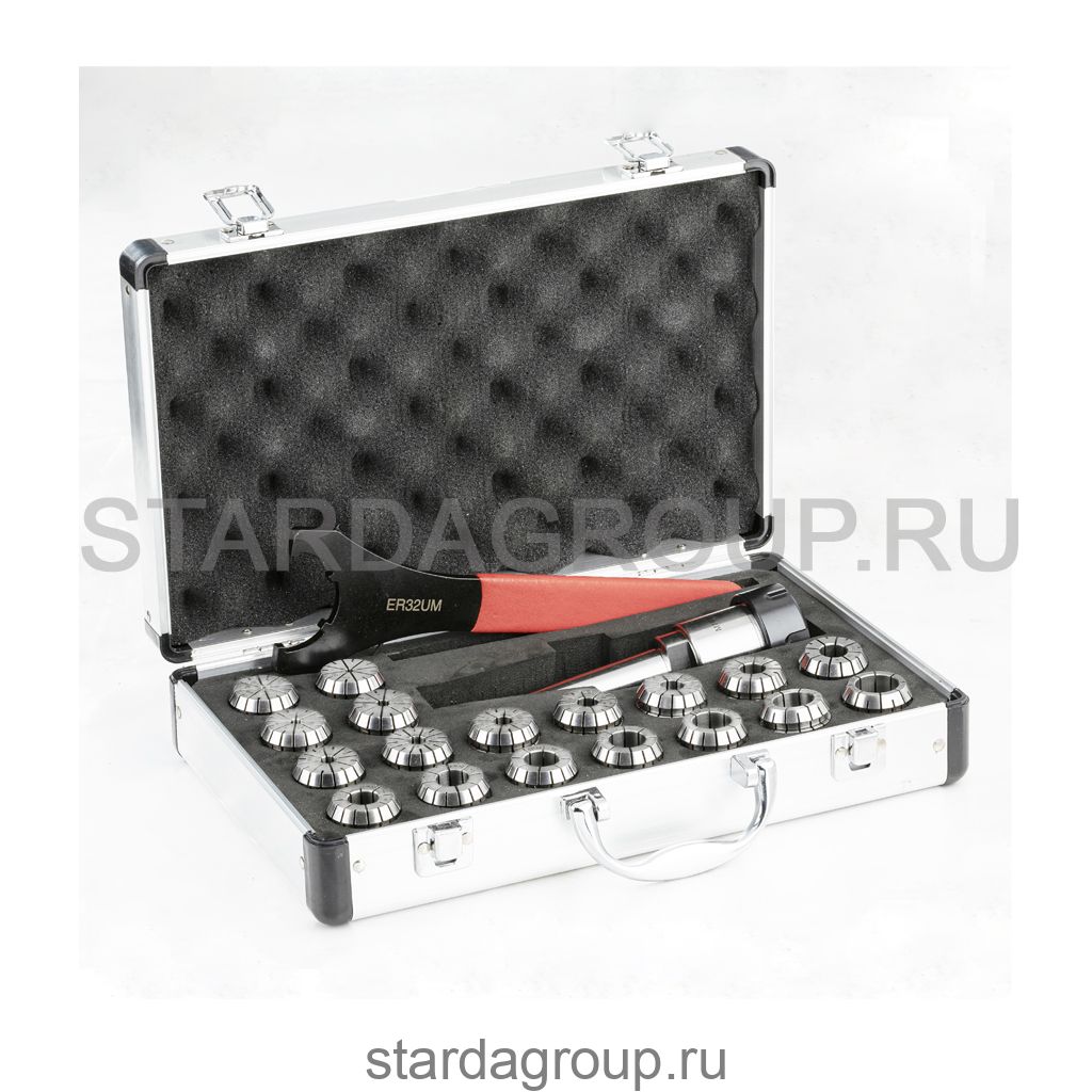 Патрон цанговый с набором цанг ER32 SENZANOME в металлическом кейсе стандартной точности 0,015. В комплекте 18 шт.