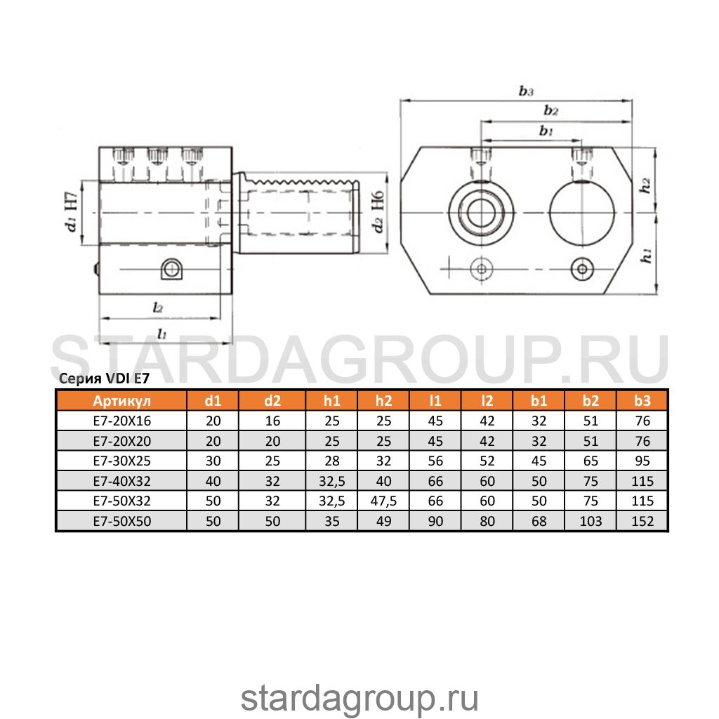 Держатель правый двойной для расточных резцов (тип E7) с хвостовиком VDI 3425 по DIN 69880 (ГОСТ 24900-81).